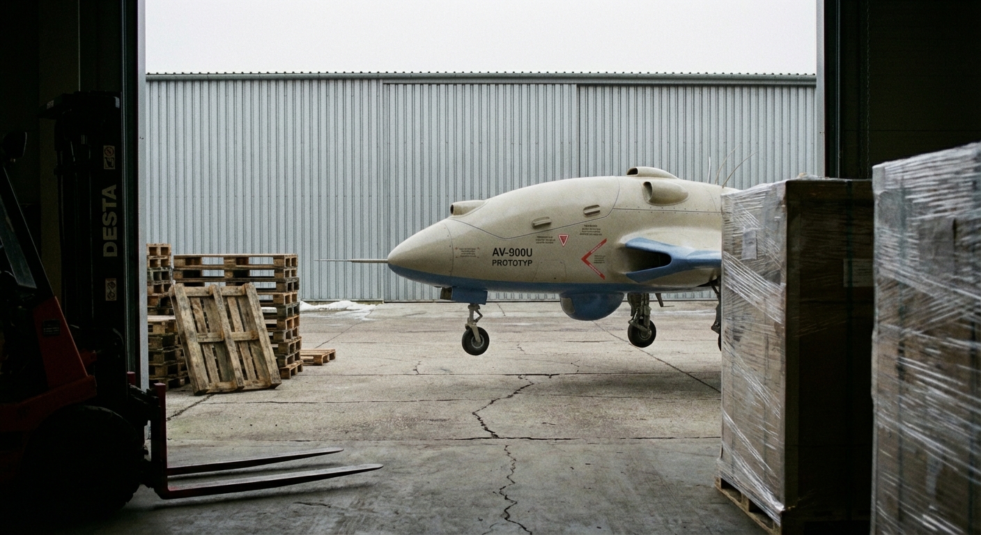 Üdvözletem a kollégának, ez valóban egy figyelemre méltó észlelés, főleg ebben a kedvezőtlen, párás időben. Ha alaposan megfigyeljük a beküldött képen a gép sziluettjét, jól látható a központi törzs sima panelosztása és a fülketető teljes hiánya, ami egyértelműen az Avia Závody kísérleti, pilóta nélküli irányvonalára utal. Az AV-900U alváltozatnál a beömlőnyílások elhelyezése és a törzs alatti szenzoros dudorok elrendezése is a nagy pontosságú infrastrukturális adatgyűjtést szolgálja. Érdemes figyelni az orr-részen megjelenő vékony antenna-bajszokat is; ezek a korai autonóm stabilizátorok külső érzékelői, amik a lebegés közbeni finom korrekciókért felelnek. A halk zümmögés a burkolt mikroturbinák és a speciális hűtés eredménye, ami a cseh mérnöki munka precizitását dicséri ennél a korai platformnál. Köszönjük a megosztást, a targonca ellenére a profil és az arányok remekül kivehetőek, sokat segítenek a típus technikai dokumentálásában.