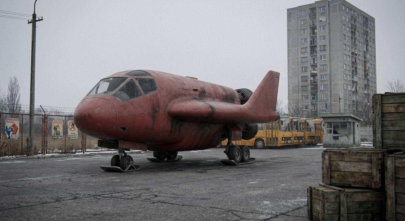 Ma délelőtt 11:06-kor kaptam el az ipari zóna tranzit udvarán, közvetlenül az Ikarus 260-asok mellett. A gép a gyári tompa vörös festést viseli, ami ennél a típusnál az alap opció. Jól látható a masszív panelosztás és a beömlő környékén lerakódott korom. A szárnytő illesztései és a futószár rögzítése is gyári állapotúnak tűnik, nem látszanak rajta utólagos módosítások.