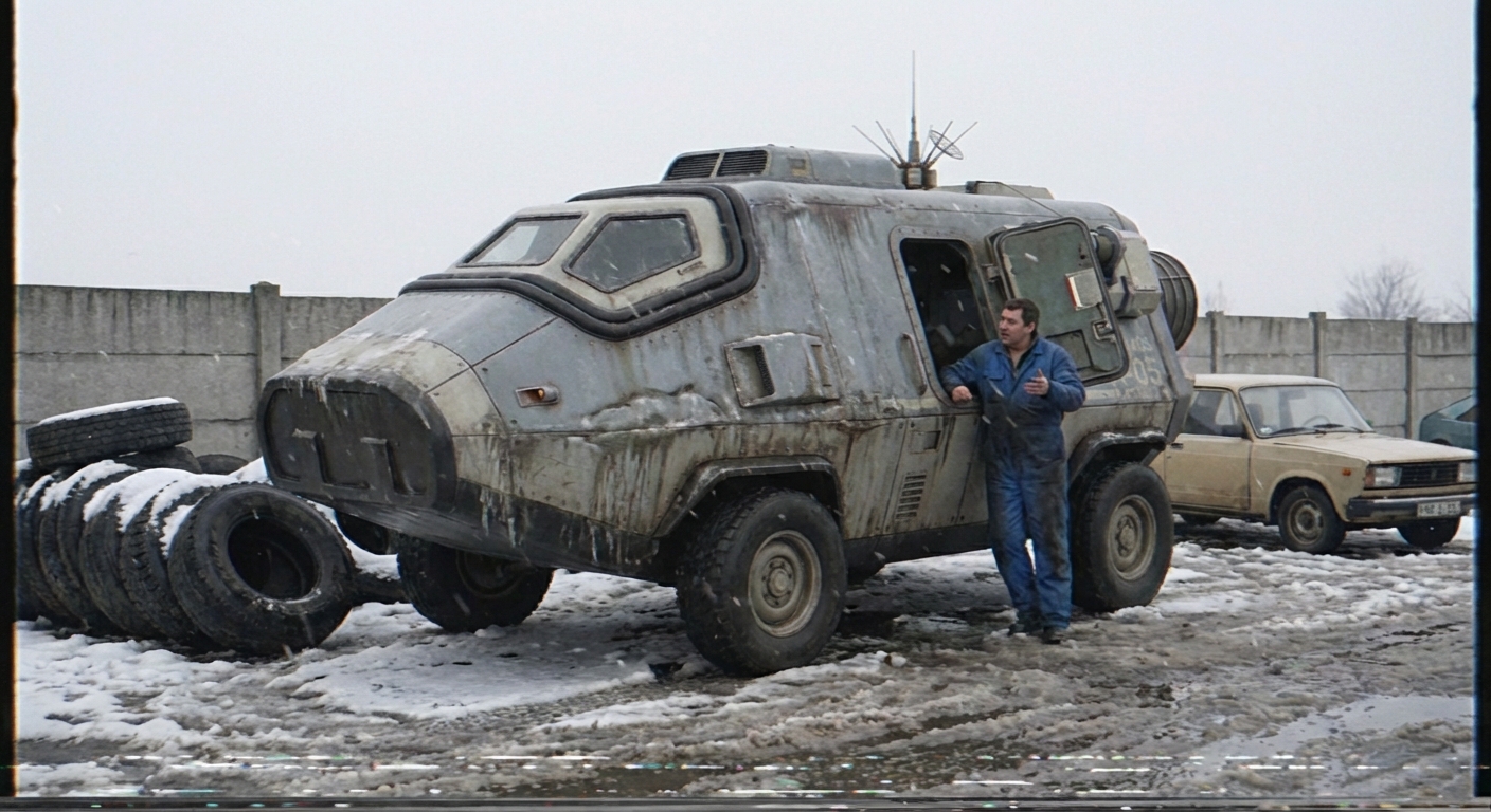 Cosina váz, erősen tolt hívás a szemcse miatt, mert a sötét árnyékok mindent elnyeltek volna. A TL-07 felirat és a hazard stripes tisztán látszik. Valami nem stimmel a hátsó rögzítésekkel, mintha nem gyári lenne a kábelezés.