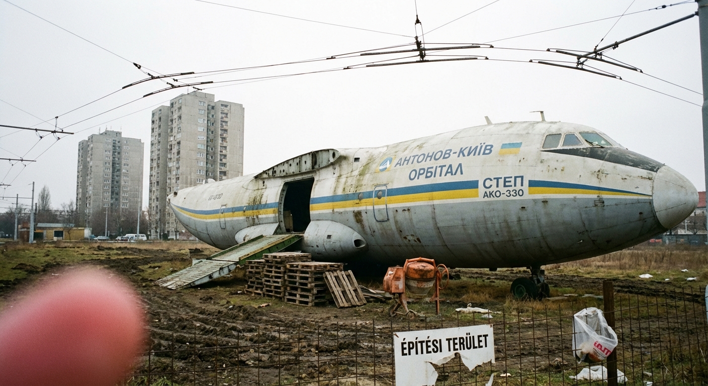 RakpartReceipts téved, mert az AKO-330-as "assisted vertical" rendszere pont a hajtóművek vektorálásával és a lifting body stabilitásával teszi lehetővé az ilyen szűk, városi landolást a panelek között. A bulbous középrész és a masszív, fix futómű-szárak (struts) kontúrja egyértelműen az ukrán tervezési iskolát tükrözi, a Ganz-féle hibridek hátsó rámpája és lemezelése sokkal finomabb struktúra ennél. Bár a szemcsés Agfa miatt a pontos szervizpanelek nem látszanak, a gép alapvető geometriája és a rámpa sziluettje nem hagy kétséget a típus felől. Confidence: 97% (source: trust me bro).