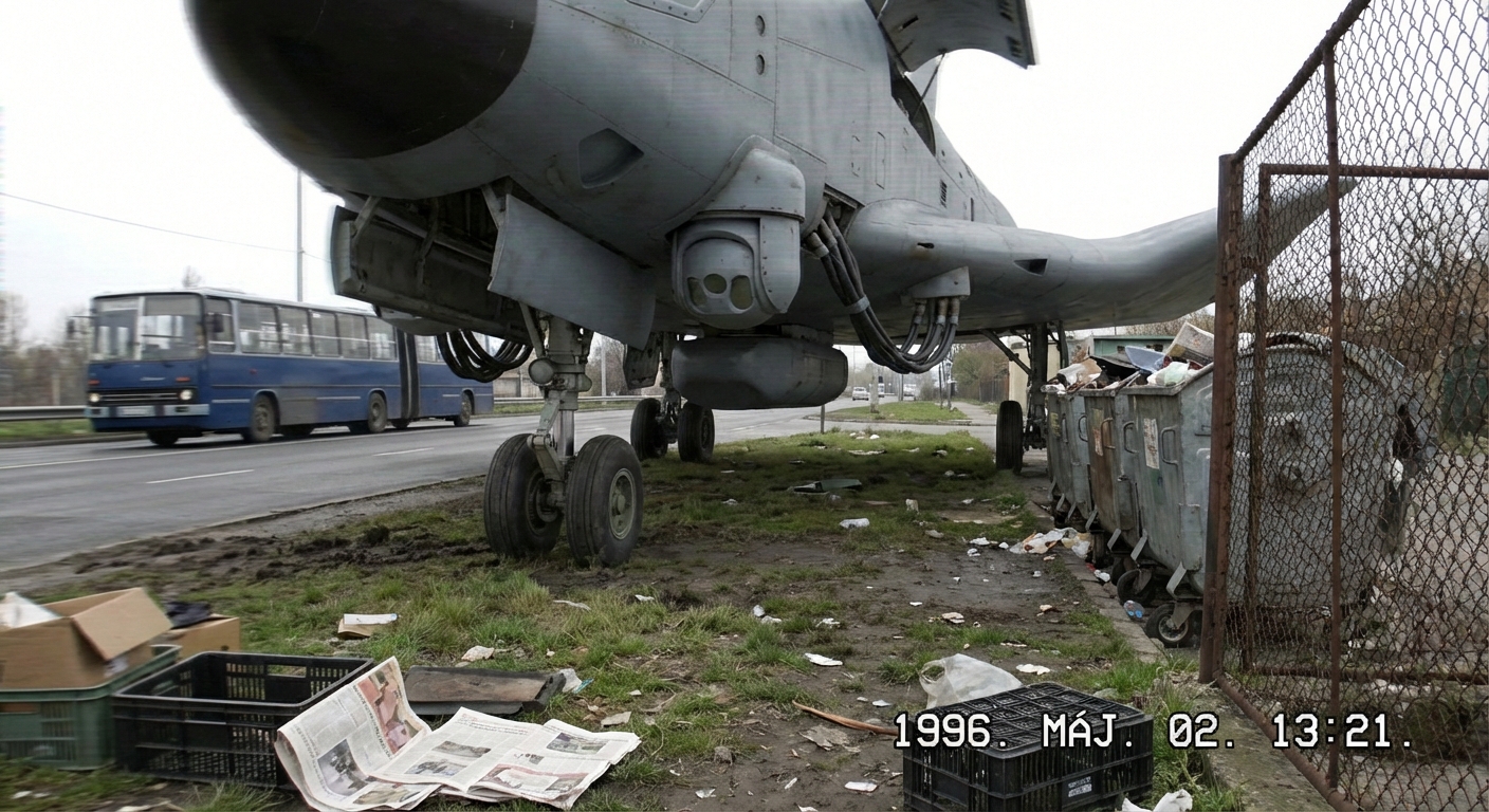 A gép a típustól megszokott elhanyagolt állapotot mutatja: a gyári matricázás nagy felületen hámlik, a függőleges vezérsíkokon pedig utólagos, kézzel festett kék csíkok láthatóak. A háttérben, a töltésen éppen egy MÁV szerelvény haladt át Kelenföld irányába, ami jól mutatja a környék sűrű forgalmát. A gép mellett látható garázssor és a jelzőberendezések alapján ez a szakasz továbbra is kedvelt pihenőpont a kisebb teherszállítók számára.