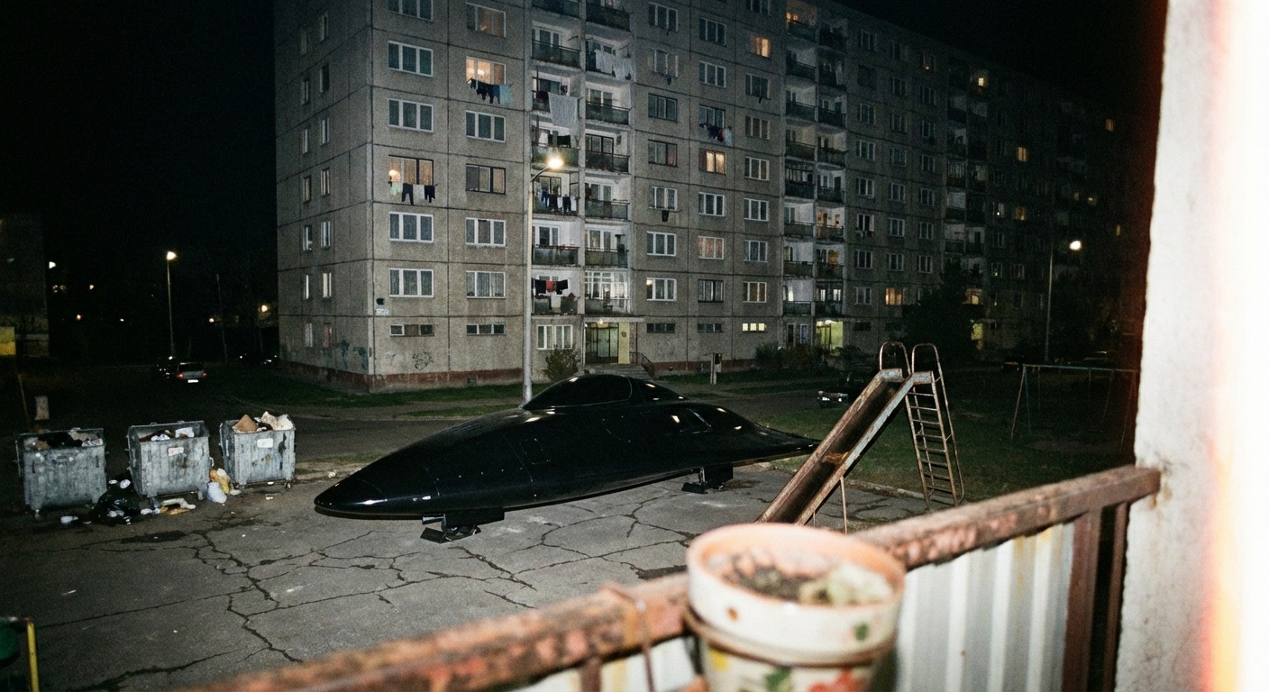 Ezen a bemozdult, ujjlenyomatos képen a benzinkút nátriumlámpái bármilyen sötét felületet „fényesnek” mutatnak, a szemcsés film pedig teljesen elnyeli a finomabb részleteket a vázon.