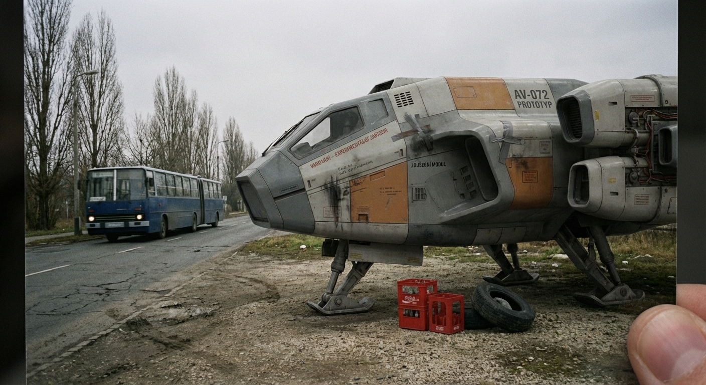 Ez egy Ikarus IK-501-es Őrszem, nem is kérdés, felismertem a dupla vezérsíkjáról a hátán meg arról a szögletes orráról. Régen a hegy alatt láttam ilyeneket hasonlót tesztelni, de ilyen közelről, a város közepén még sose. A kép kicsit ferde lett, meg a film is szemcsés ebben a sötétben, de hát sietni kellett, nem volt időm állványt állítani a lindenfa mellé.