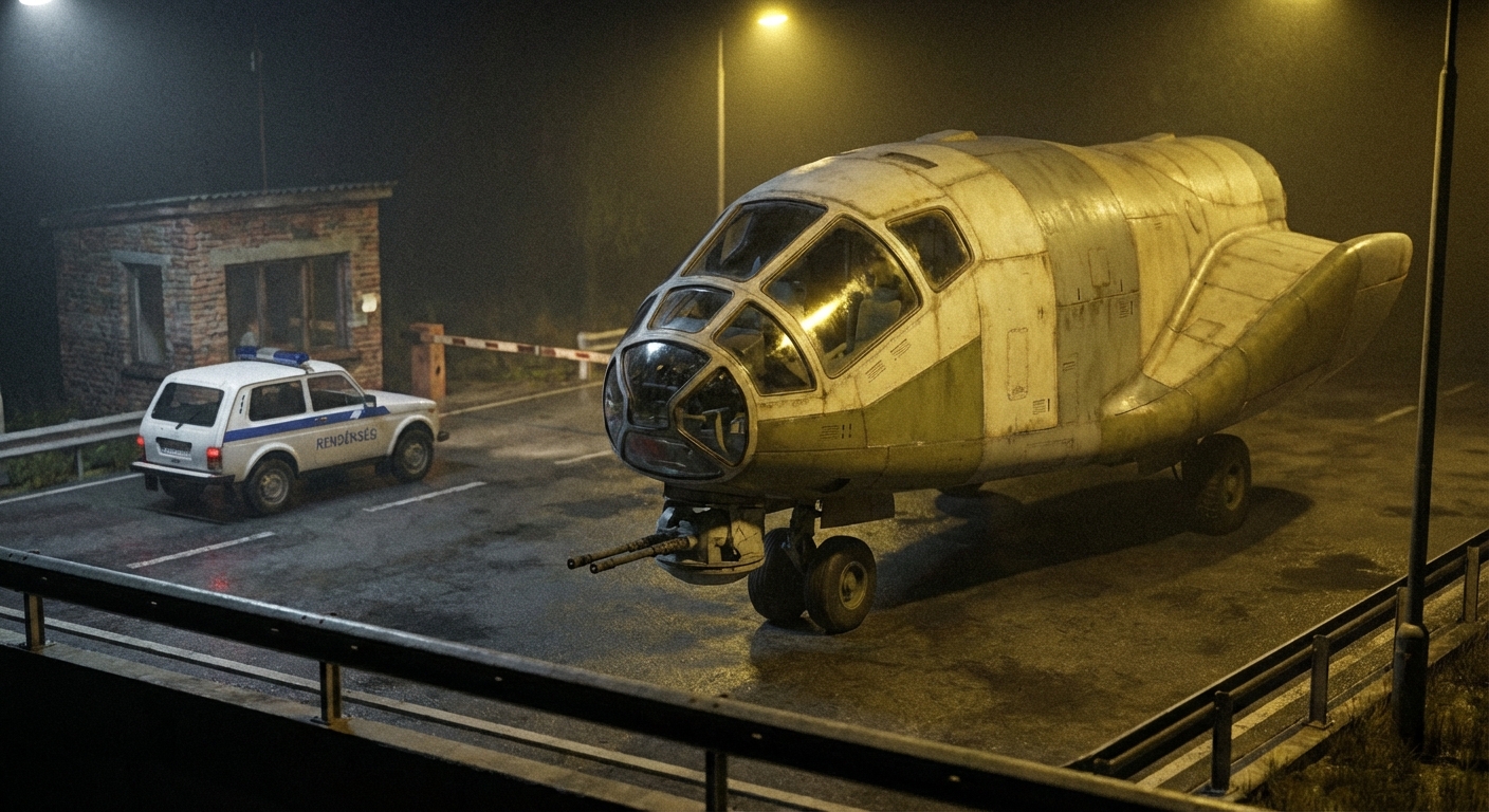 Üdvözlet; a felvételen látható AKO-067 Rampa lifting body profilja és a törzsbe integrált emelőventilátorok elhelyezkedése kifejezetten az ilyen előkészítetlen, poros terepen történő vertikális irányváltásokra lett optimalizálva. A típus alacsony sebességű manőverező képessége és a robusztus, fix futóműszárak lehetővé teszik a stabil megállást a mezőgazdasági utak mentén is, ahol a talaj egyenetlenségei más, behúzható futóműves egységeknél komoly mechanikai feszültséget okoznának a sárkányszerkezeten. A leírt porfelhő intenzitása a stabilizáló fúvókák és a fő ventilátorok közötti nyomáskülönbség eredménye, ami a leszállási fázis utolsó méterein a legkritikusabb a hűtőrendszer szerviznyílásainak védelme érdekében. Az észlelés helyszíne és az idősáv alapján ez a gép valószínűleg egy logisztikai konvoj támogató egysége, amely a közeli ipartelepek és a falusi depók közötti útvonalon mozog. Érdemes visszakeresni az 1995-ös „Southern Border Logistics” topikot, ahol a párkányi (Štúrovo) kollégák már dokumentáltak hasonló AKO egységeket folyami rakodás közben. A gép statikus állapota és a környező porfelhő leülepedése alapján egy rövid technológiai fordulót láthatunk a felvételen az irányváltás előtt.
