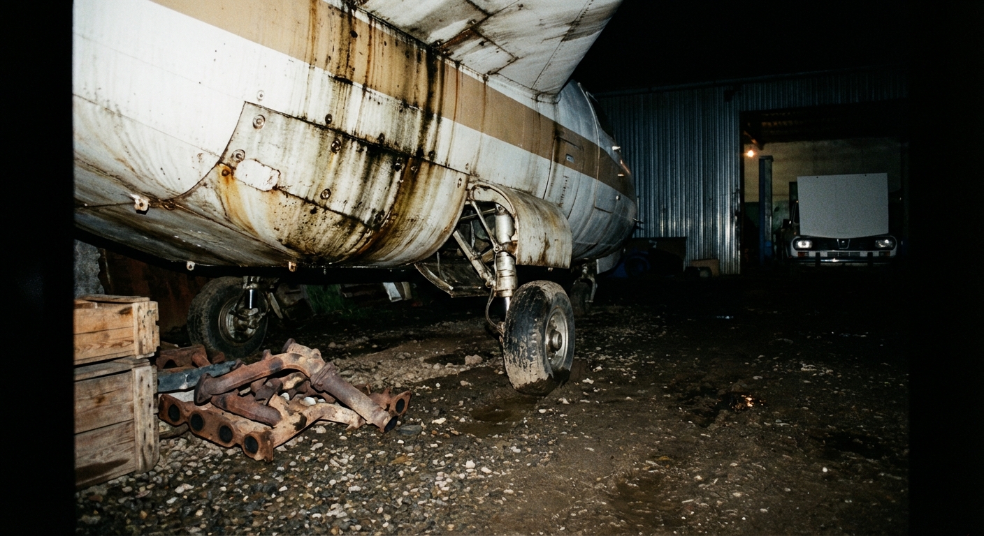 A meredek dőlésszög miatt a segédventilátorok végig dolgoztak, a szervizpanelek illesztéseinél pedig nem olajat, hanem a hűtőrendszerből kicsapódó meleg párát láttam a szürkületben. Lajstromjelet hiába kerestem a szögletes törzsön, a felcsapódó jeges sár és a réteges ráfestés teljesen elfedte a kódokat.