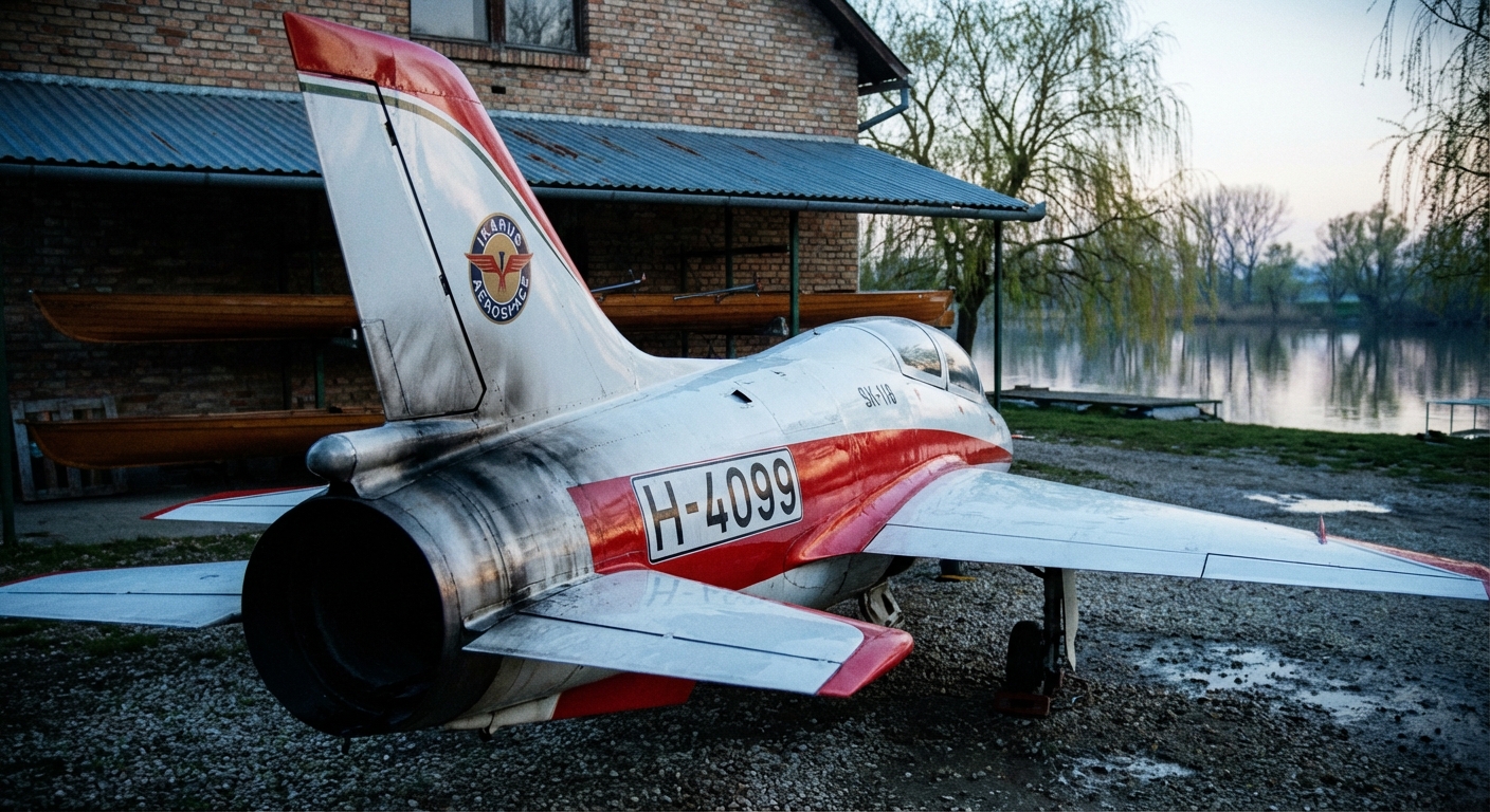 A kép kompozíciós nehézségei ellenére a törzs oldalán felsejlő, széles lamellás hűtőbeömlő rácsok és a jellegzetes kifúvó nyílások elhelyezkedése alapján ez minden bizonnyal egy Ikarus IK-332 Varjú. Figyelemre méltó, hogy a gép hőcsere folyamatát segítő rácsszerkezete mennyivel funkcionálisabb és ellenállóbb a szennyeződésekkel szemben, mint mondjuk a VEB Formwerk hasonló kategóriás egységeinek megoldásai, bár egy közeli részletfotó a panelillesztésekről sokat segítene a pontosabb azonosításban.